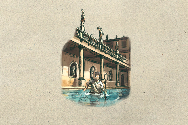 The location is now home to the ancient Roman Bathhouse, which was built to expand the original bathing spot depicted in legend. At the doorway to the Great Bath itself, in tribute to his legend, is a statue of Prince Bladud and one of his pigs.